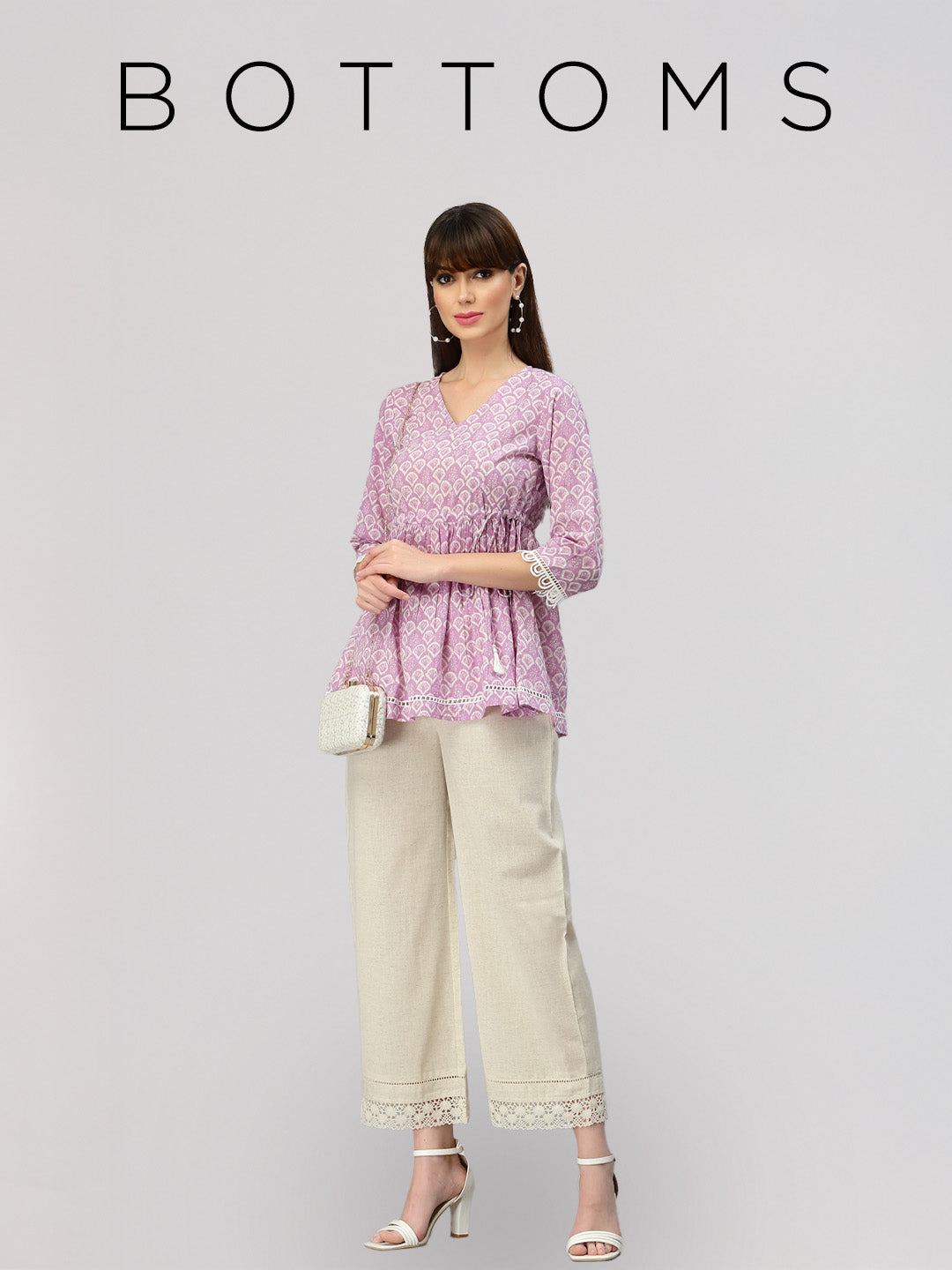 For women who enjoy balanced styling, Qomn offers a breezy collection of elegant bottom wear for women, including white cotton palazzos and white palazzo for women's pieces. Not only are these bottoms stylish, but they are easy to style! You can pair these bottoms with a kurta, top or tunic for a practical yet chic outfit.